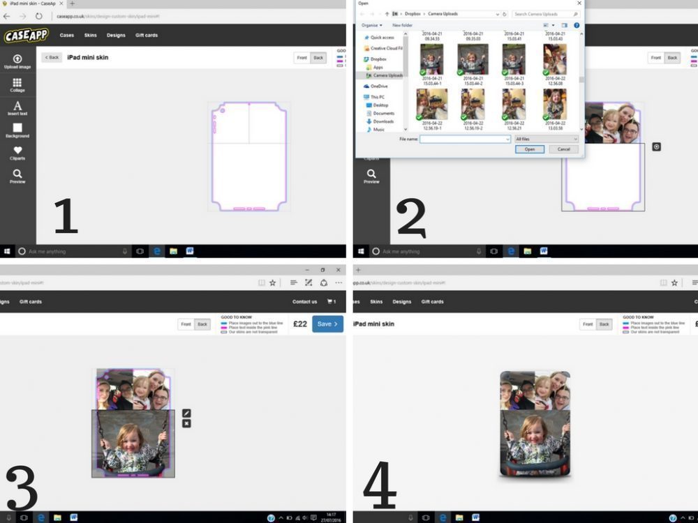 CaseApp allow you to create customised phone case/ipad skin for all of your devices, which you can either create on their website or use their pre-designed images. I decided to design an iPhone 6 case for myself and an iPad Mini skin for Mia as she currently has a plain black case on it. It’s really simple to create your case and skin, either upload your own image(s) or design straight onto the blank canvas: