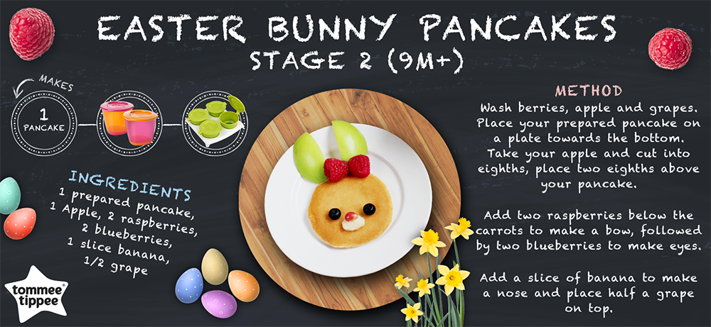 Mia is obsessed with pancakes at the moment and loves them as a treat for breakfast so these are great for toddlers 9m+ to get involved on Easter Sunday morning. You can even create the cute bunny too!
