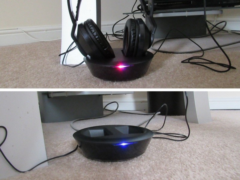 Once done the first time, they seem to connect straight away every time now so I don’t know if it’s just an initial setup issue or not. A clear red light shows that the headphones are on charge, both red and blue lights mean that the base and headphones are synced up on the same channel and you will hear the tv sound through them.
